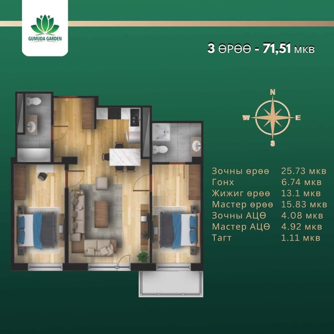 Яармаг, Нүхтийн аманд байрлалтай Гумуда гарден хотхонд мастертай, ургшаа харсан 3 өрөө байр худалдана.